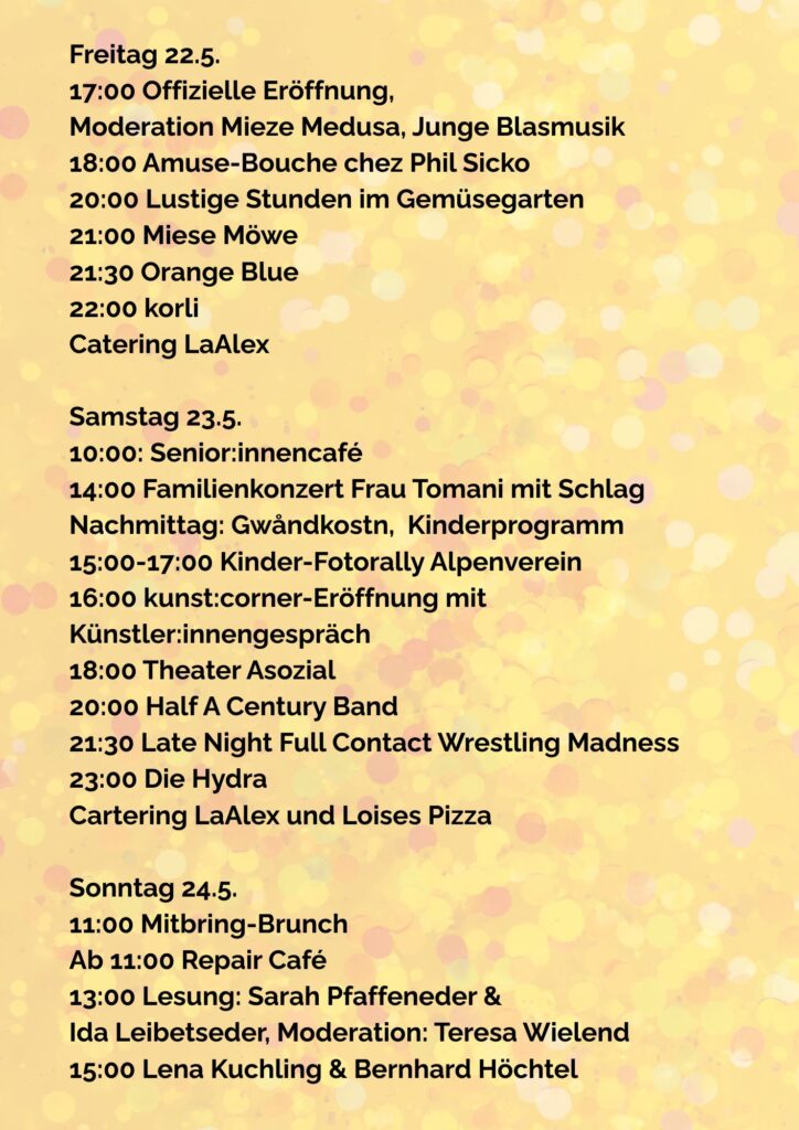 Veranstaltungskategorien: | Fest, Kunst:corner, Lesung, Moderiertes Gespräch, Musik, Sound, Theater